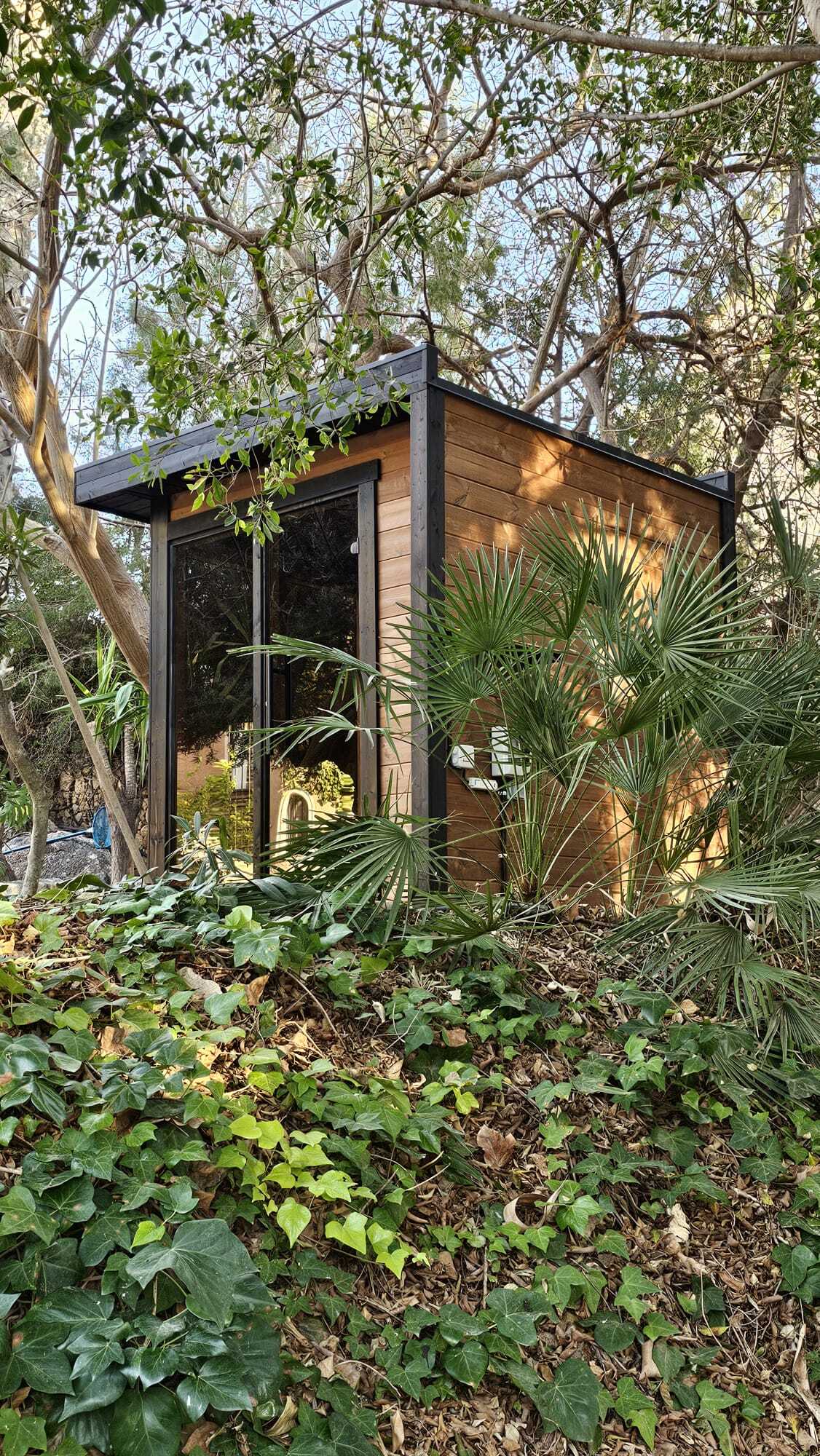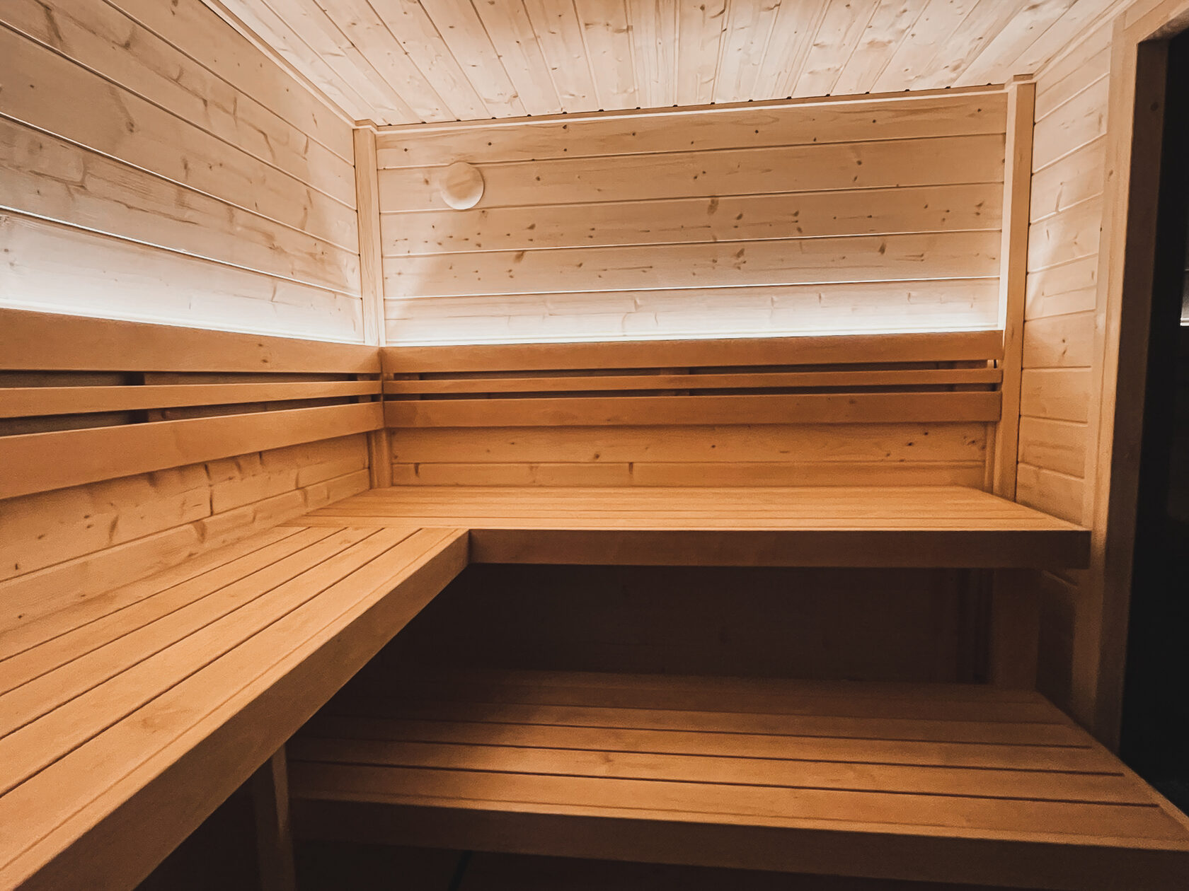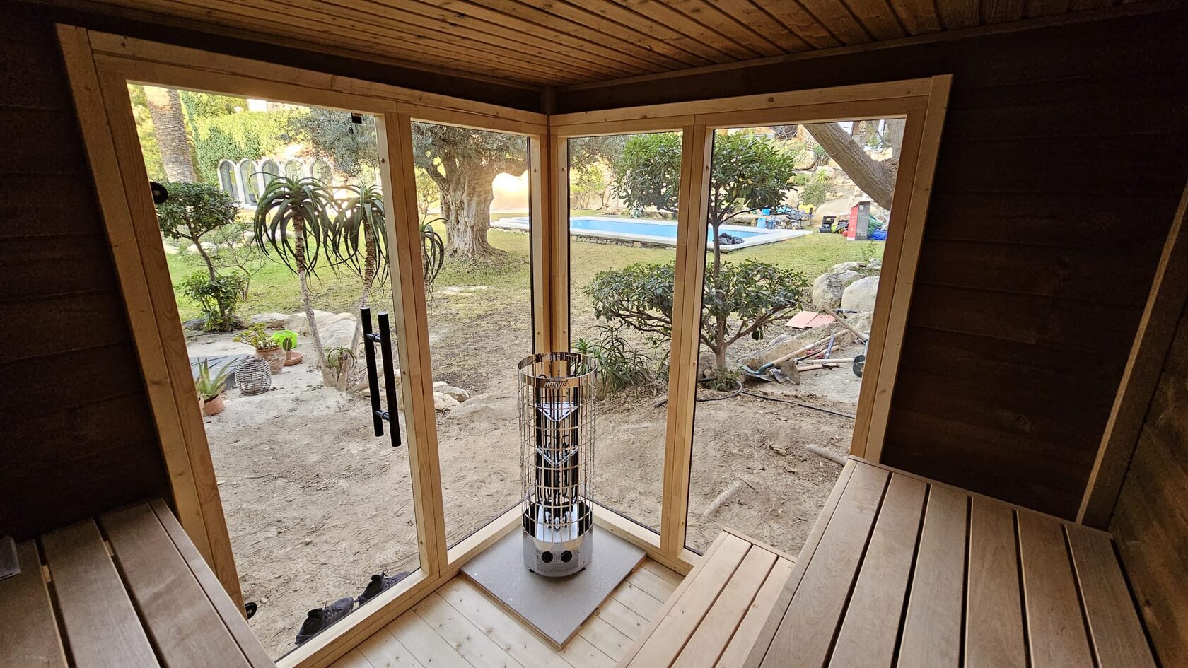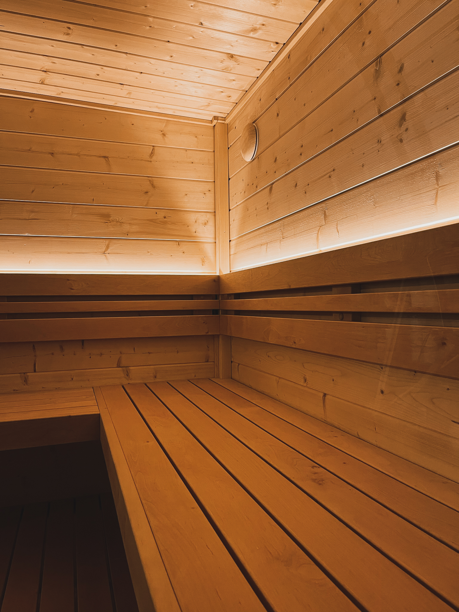 Duże, podwójne przeszklenia z hartowanego szkła zacierają granicę między wnętrzem sauny a ogrodem, wprowadzając spokój natury do środka. To przestrzeń stworzona do „leil” – delikatnego, uzdrawiającego ciepła, które regeneruje ciało i umysł po ciężkim dniu.