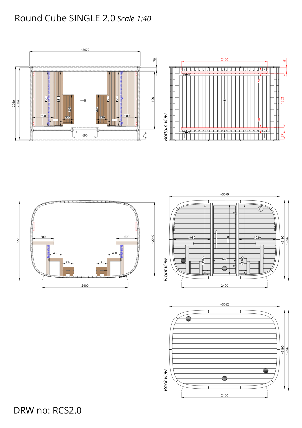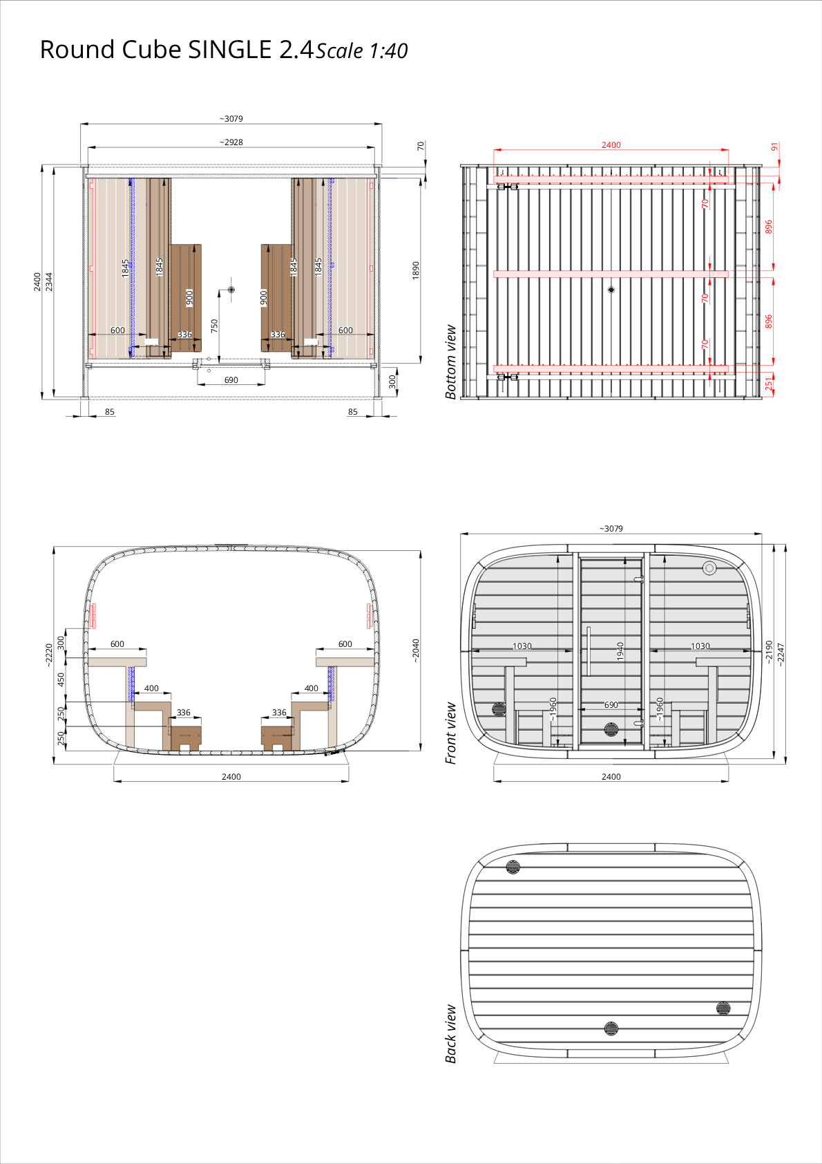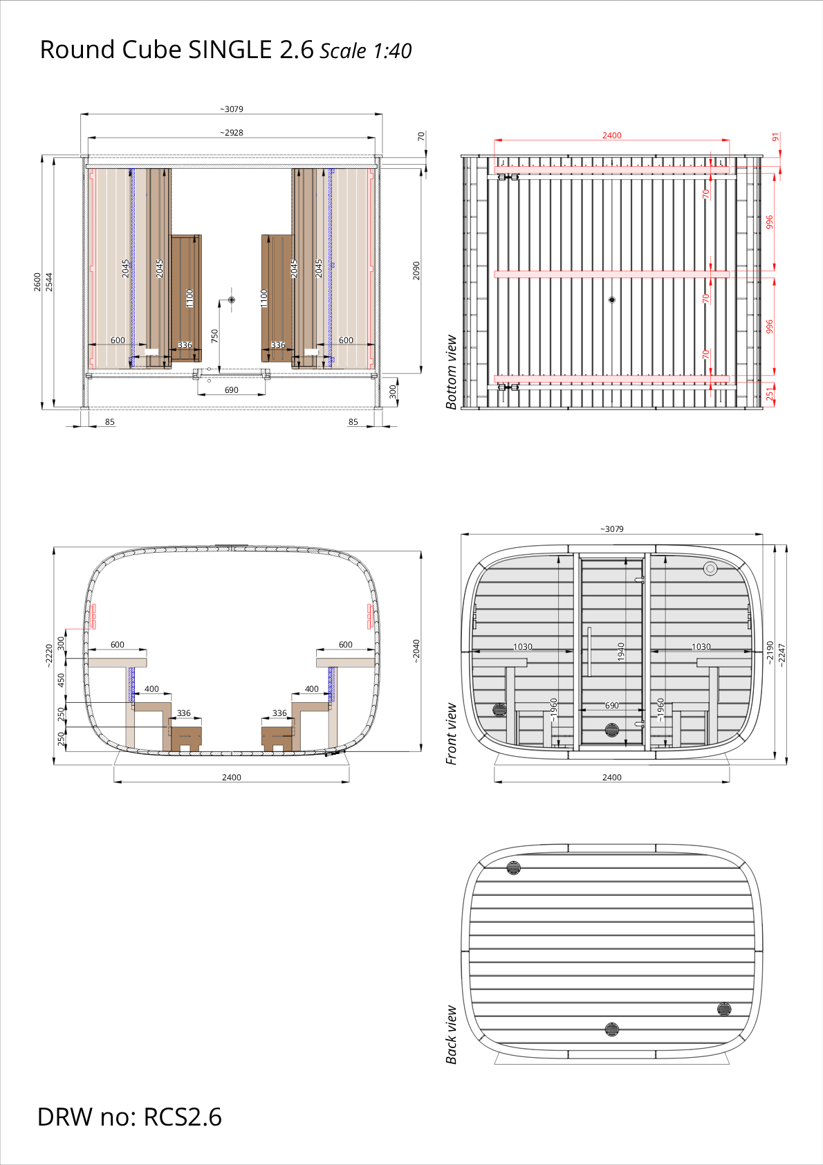 | Waga sauny | 2m - 960 kg, 2.4m - 1010 kg, 2.6m - 1050 kg. Podłoże pod saunę powinno wytrzymać obciążenie do 1700 kg (wliczając użytkowników). |